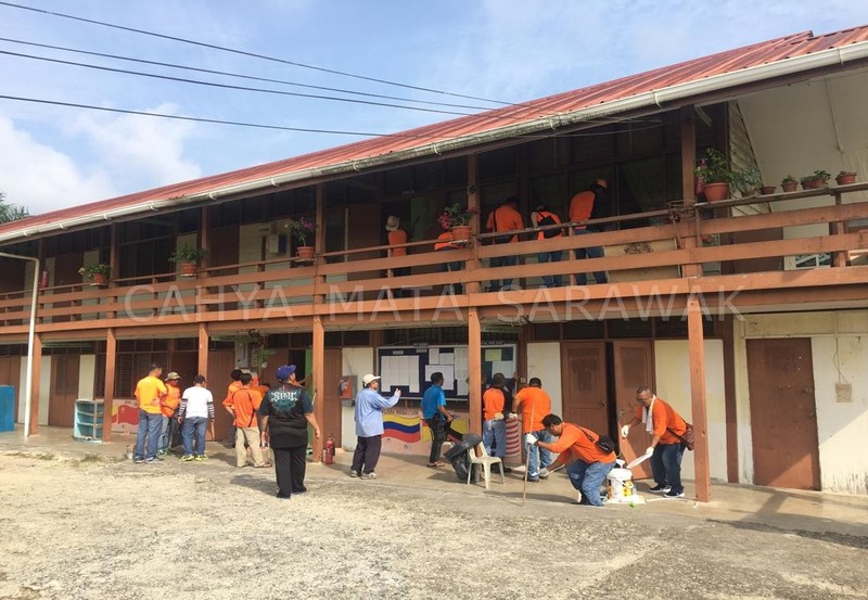 16 November 2019 – SK Sungai Durin, a primary school in the outskirts of Sibu, reached out to CMS Roads Sdn Bhd (RMU Sibu) for help with some maintenance work to paint its wooden school buildings. The students’ parents and teachers participated in the minor makeover alongside 42 volunteers from the company to cut the overgrown grass around the school compound and paint the administration and washroom buildings. Heavy machinery such as tipper trucks, a mini hydraulic excavator and pedestrian roller were also used by our CMS employees to lay and compact the aggregates to widen and repair the uneven pathway inside the school compound. CMS Roads donated 12 tonnes of aggregate for this activity.